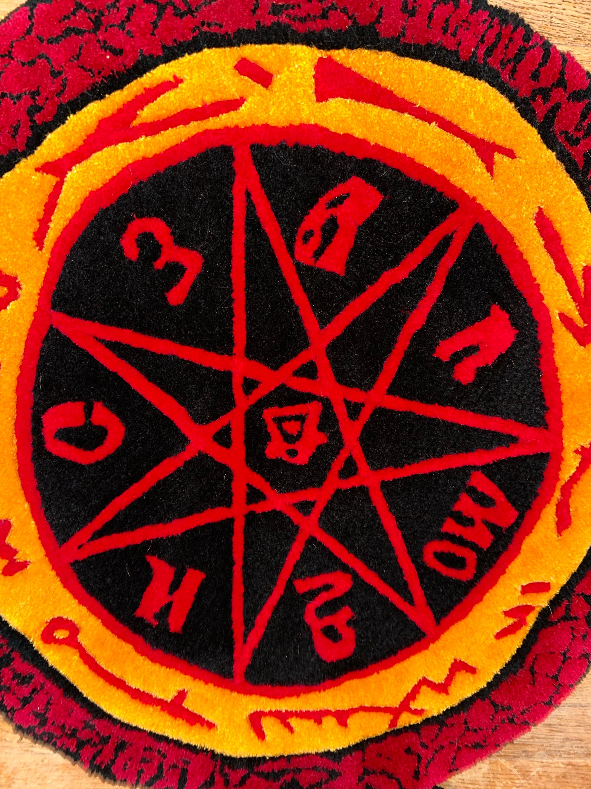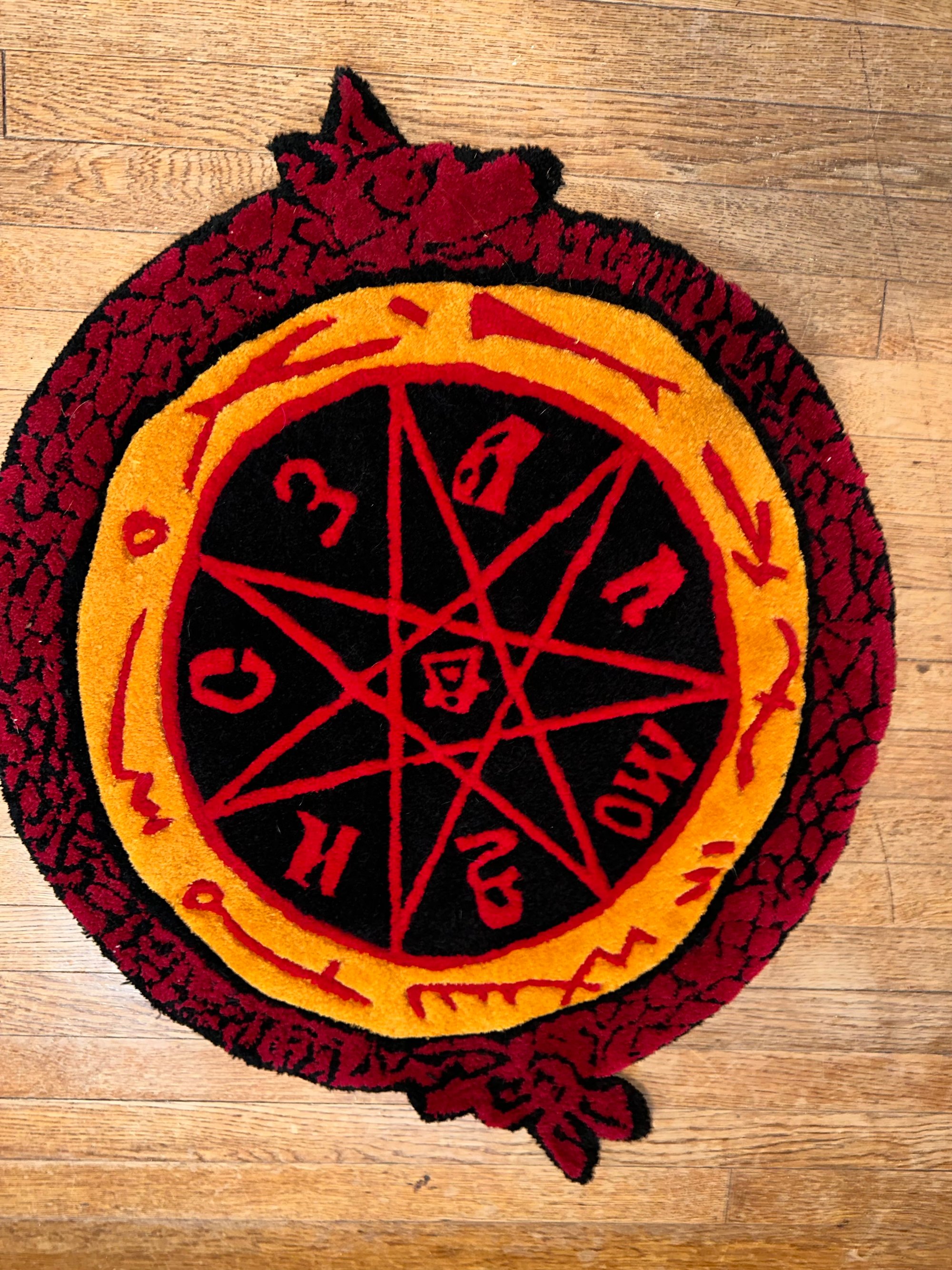 Hand tufted hand carved with acrylic yarn and thick rubber non skid mat backing. This beautiful rug would be perfect for your dark lair, ready to be bounced on crazzzy style. 37inches by 28inches.